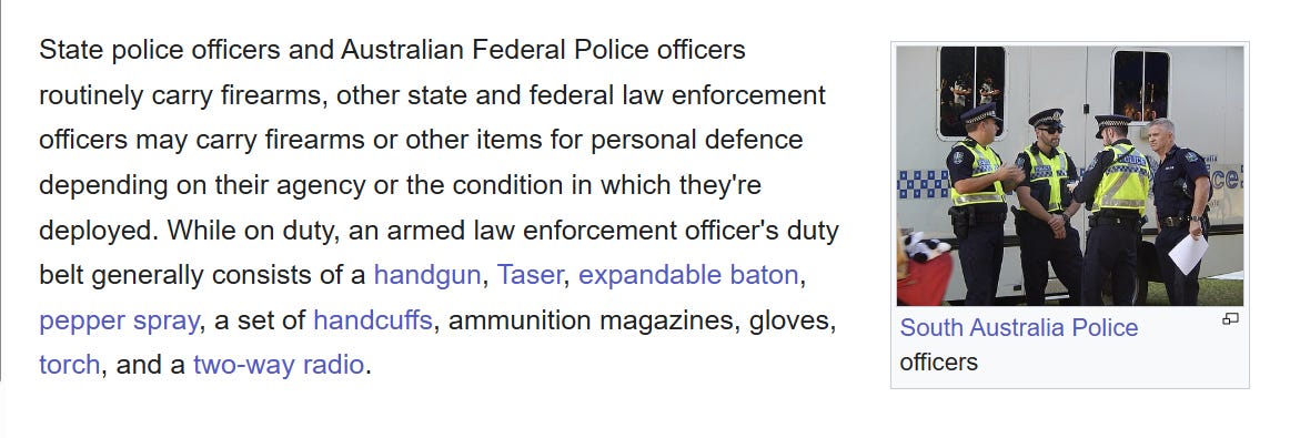 “Self,” I said to my self, as the twitching started, “The Aussies are probably following the example of the Brits, and their officers don’t routinely carry guns.”