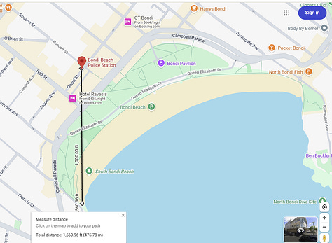 That looks like a couple of blocks to me. 500 metres — more or less — as the crow flies. A distance that my 58-year-old, moderately crippled arse2 can cover in about four minutes while carrying a 9mm pistol.