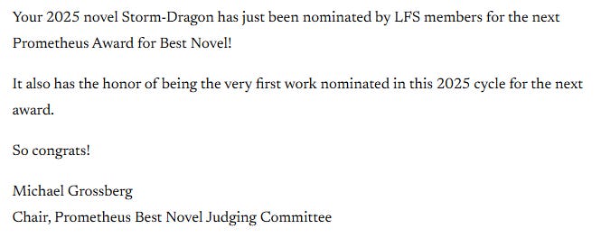 However, seems like we’re not the only ones who thought it was a damned decent bit of writing — Dave not only snagged a nomination for the Prometheus Award, he got the first nomination of the next cycle: